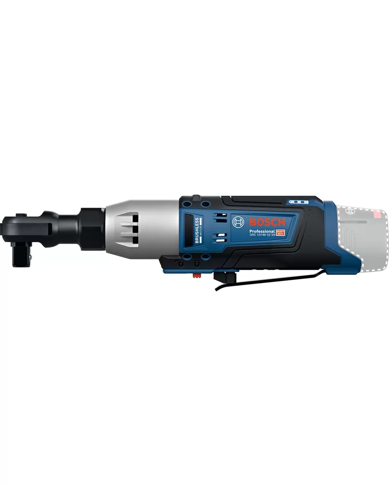Ráčnový klíč Bosch GRC 12V-60 1/2 SN nabízí vynikající ovládání a díky ergonomickému designu a štíhlejšímu obvodu se pohodlně drží. Je ideální na práci ve stísněných prostorech díky kompaktnímu 12V systému. Tento ráčnový klíč se pohodlně a intuitivně ovládá, má spoušť se snadným variabilním nastavením otáček a LED světlo pro jasnou viditelnost i při práci v tmavých rozích. A co víc, GRC 12V-60 1/2 SN je díky vysokému krouticímu momentu výkonný a efektivní.