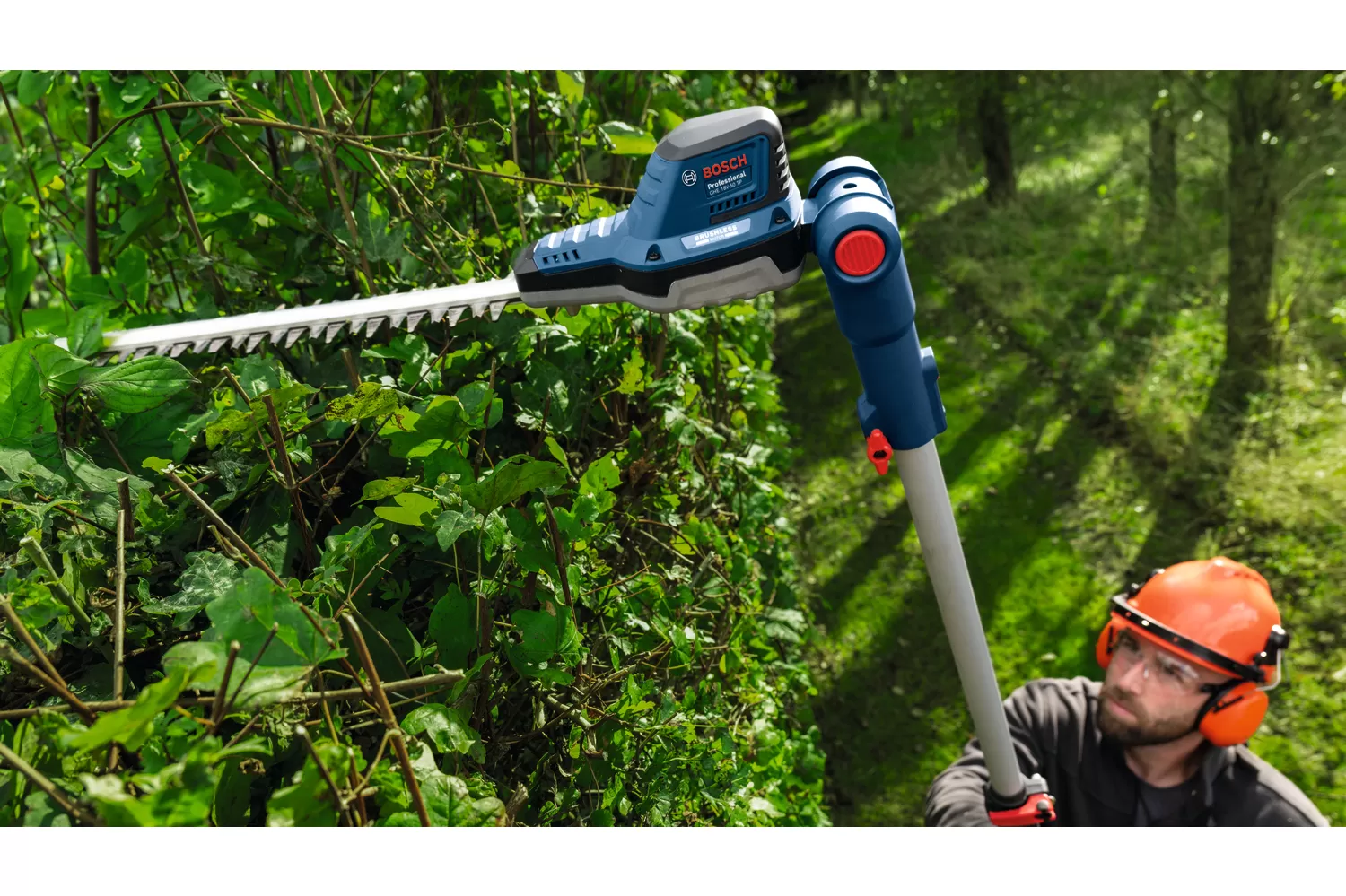 Teleskopické nůžky na živé ploty GHE 18V-50 TP Professional jsou ideálním nářadím pro prořezávání silnějších větví ve výškách. Kompatibilní s profesionálním 18V systémem Bosch a aliancí akumulátorů různých značek AMPShare.