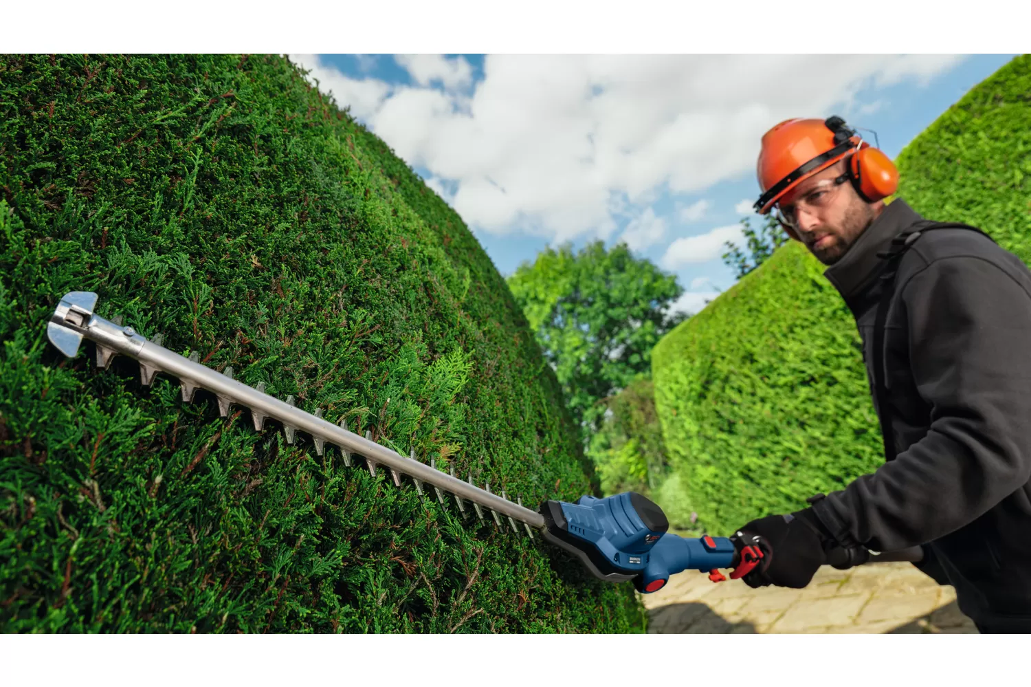 Pokud hledáte výkonné nářadí, které efektivně zastřihuje vysoké živé ploty a stromy, a bez potíží s benzínem a výpary, pak jsou pro vás teleskopické nůžky na živé ploty GHE 18V-50 TP Professional to pravé. S tímto nářadím bez námahy a bez žebříku dosáhnete až na vrchol vysokého živého plotu, a to díky 2,5m teleskopické tyči a nastavitelné šikmé hlavě. Díky spoušti s proměnnými otáčkami a patentovanému antiblokovacímu systému Bosch toto nářadí zabraňuje zasekávání a usnadňuje tak stříhání silnějších a vyšších větví. Šikmá stříhací hlava navíc nabízí ergonomické stříhání z různých úhlů pro úhledné zakončení vrcholků a boků živých plotů.